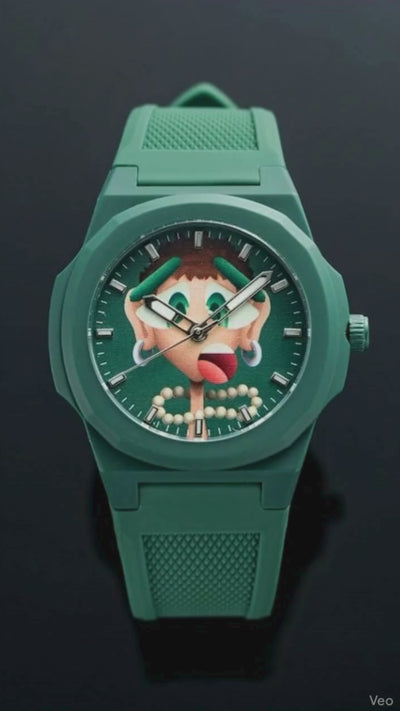 Cette collaboration exclusive dévoile une montre vert foncé, élégante et affirmée, dont le cadran est orné d’un dessin original dans le style emblématique de Woze.